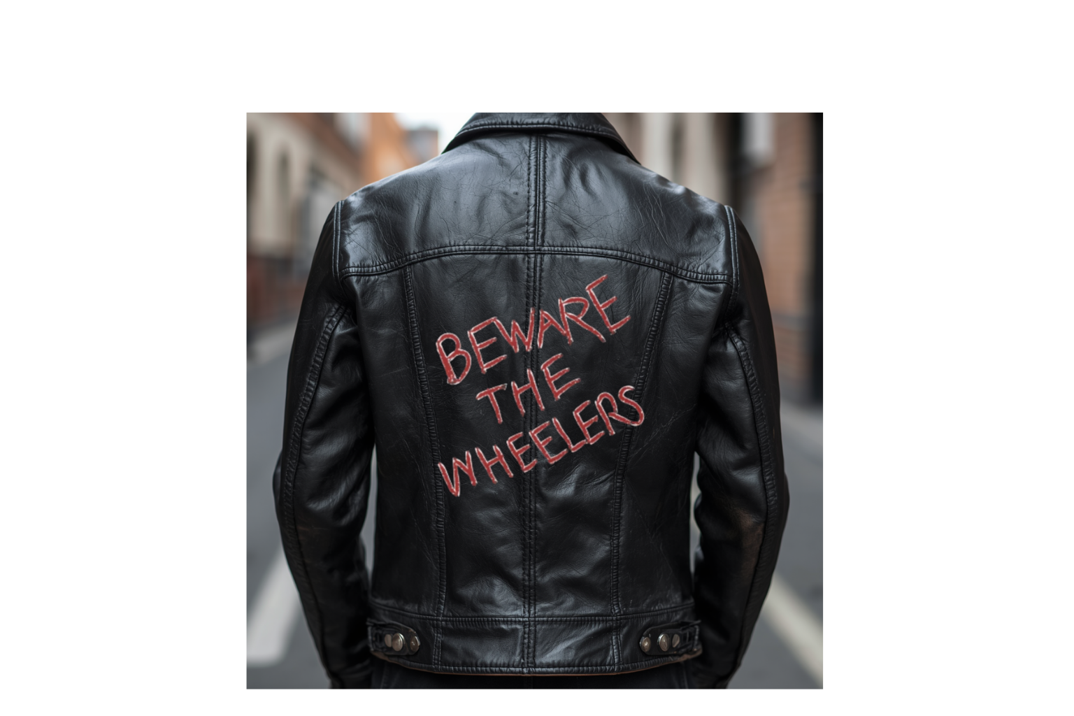 • Inner lining: "punk style, with irregular lettering red and white, as if it were scratched onto the fabric or something like that." The reference image also depicts the same.
